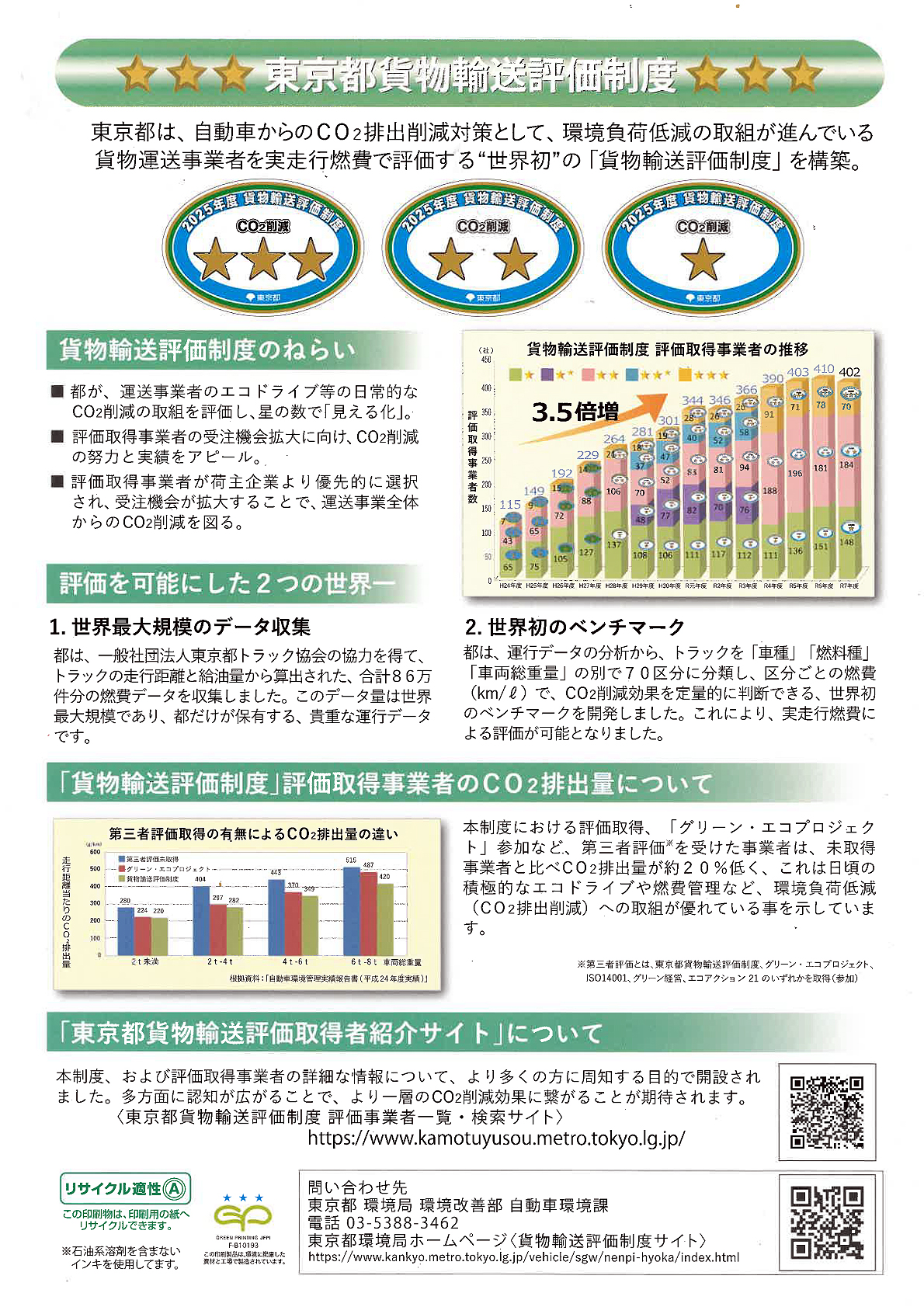 東京都環境局が主管する、自動車からのCO2削減を推進する取組みとして、貨物運送事業者のエコドライブ等の日常的な努力を実走行燃費で評価する「貨物輸送評価制度」(下図参照)において当社が2025年も2つ星を獲得しました。当社のドライバーへの教育訓練、指導体制構築、燃費管理、燃費データベース構築などが総合的に判断された結果となります。